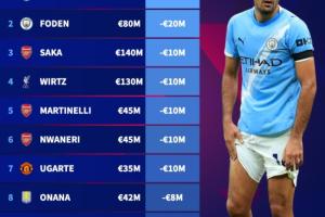 體育資訊10月17日訊 德轉(zhuǎn)更新英超身價(jià),其中跌的最多的是羅德里和福登,他們身價(jià)都下降了2000萬歐。