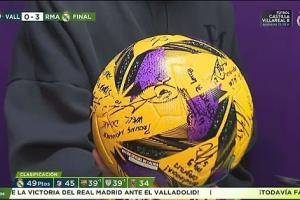 體育資訊1月26日訊 今天凌晨,姆巴佩在皇馬3-0擊敗巴拉多利德的比賽中上演帽子戲法,賽后他向皇馬TV鏡頭展示了皮球,上面寫滿了隊友的簽名和祝福。