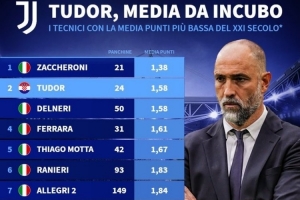 圖多爾帶隊(duì)場(chǎng)均1.58分,是21世紀(jì)場(chǎng)均積分并列第二少的尤文教練