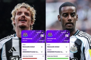伊薩克上賽季:場均射門2.5次、射正1.5次,近0.8球;射門-進球轉化率30.26%,傳球16.5次,成功率77.05%;快速做球1.6次,造犯規(guī)0.5次,成功爭頂0.9次,地面成功對抗2.2次,奪回球權1.8次。