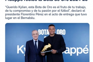 在這里,你正穿著你如此渴望的白色球衣,書寫著你自己的歷史。我們的球迷崇拜你,并將在每一次挑戰(zhàn)中陪伴你。親愛的姆巴佩,這座金靴獎對你來說是繼續(xù)贏下去、繼續(xù)為皇家馬德里的偉大歷史做出貢獻的又一動力。