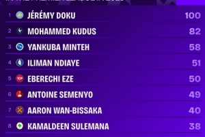 體育資訊11月10日訊 英超第11輪比賽,多庫完成7次過人,打進1球,幫助曼城3-0擊敗利物浦。據(jù)Squawka統(tǒng)計,多庫是2025年首位英超成功過人達到100次的球員。