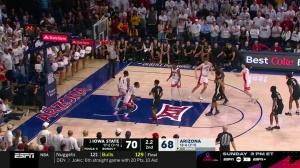 本場比賽最后2.2秒,亞利桑那大學(xué)落后3分,凱萊布-洛夫在后場接底線發(fā)球,運兩步后直接在中線后的logo處出手,球劃過一道超長弧線鉆入籃筐,將比賽拖入加時。亞利桑那大學(xué)士氣大振,加時賽乘勢追擊,打出一波15-4帶走比賽。