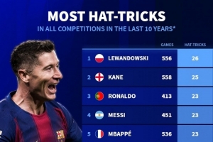 體育資訊11月10日訊 德國轉(zhuǎn)會市場統(tǒng)計了近10年前十聯(lián)賽球員的戴帽次數(shù),并列出榜單。