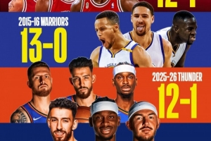 開賽13場后,雷霆以12勝1負(fù)的戰(zhàn)績追平了96公牛的同期紀(jì)錄,在杰倫·威廉姆斯因手腕傷勢持續(xù)缺陣的情況下,雷霆在13場比賽中凈勝對手202分,場均凈勝分高達驚人的15.5分。