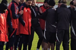 體育資訊1月29日訊 今天,曼聯(lián)進行了訓練,備戰(zhàn)后天凌晨的歐聯(lián)杯聯(lián)賽階段收官戰(zhàn),曼聯(lián)球員為阿莫林和弗萊徹慶祝了生日。