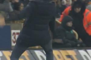 水晶宮在下半場(chǎng)6分鐘2球完勝狼隊(duì),主帥格拉斯納在場(chǎng)邊激情慶祝差點(diǎn)滑倒,隨后他順勢(shì)轉(zhuǎn)圈握拳鼓勁。