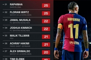 體育資訊1月30日訊 歐冠聯(lián)賽階段已經(jīng)全部結(jié)束。Squawka統(tǒng)計(jì)了聯(lián)賽階段球員創(chuàng)造機(jī)會(huì)次數(shù)的排行榜,其中,拉菲尼亞和維爾茨創(chuàng)造25次機(jī)會(huì),排在榜首。