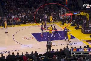 末節(jié)9分48秒,時間靜止,湖人的進(jìn)攻時間也鎖定在了15秒,這個回合最終文森特轟進(jìn)底角三分