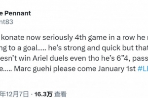 彭南特寫(xiě)道:“我真是受夠科納特了,這已經(jīng)是他連續(xù)第四場(chǎng)比賽犯錯(cuò)導(dǎo)致失球了……他雖然身體強(qiáng)壯速度快,但僅此而已,技術(shù)簡(jiǎn)直糟糕透頂,明明身高1米93卻連空中對(duì)抗都贏不了,傳球水平跟業(yè)余聯(lián)賽球員沒(méi)兩樣,格伊請(qǐng)務(wù)必在1月1日加盟利物浦。”