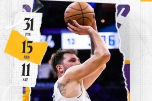 賽后,湖人官推發(fā)布東契奇數(shù)據(jù)海報(bào):又一場(chǎng)三雙表現(xiàn)??