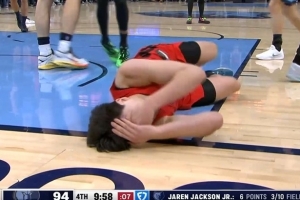 "倒地不起之后,裁判并沒有吹停比賽。根據(jù)規(guī)則,在這種情況下比賽通常不會被叫停。我記得卡梅隆·安東尼曾經(jīng)也有過類似的情況,他在一次比賽中臉部被擊中后倒地,幾乎整整一分鐘的比賽時間內(nèi)都躺在地上,期間雙方進(jìn)行了多次攻防轉(zhuǎn)換。這時除非教練叫暫停,否則比賽一般不會因此中斷。有時候裁判會吹停比賽,但如果球員沒有妨礙到比賽進(jìn)行,他們通常不會這么做。像這樣的情況,比賽還是會繼續(xù)進(jìn)行,直到出現(xiàn)自然的停頓或者有人叫暫停。如果沒有的話,裁判也沒有義務(wù)必須吹停比賽。我并沒有覺得裁判在操控比賽。”