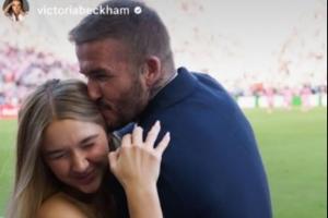 在奪冠現(xiàn)場,邁阿密國際老板貝克漢姆與家人一起慶祝奪冠,在維多利亞曬出的圖中,貝克漢姆親吻小七。