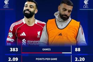薩拉赫出場&不出場利物浦數(shù)據(jù)對比: