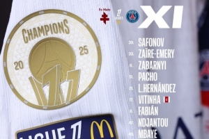 巴黎首發(fā):39-薩福諾夫、33-扎伊爾·埃梅里、6-扎巴爾尼、51-帕喬、21-盧卡斯·埃爾南德斯、17-維蒂尼亞、8-法比安·魯伊斯、47-恩賈恩圖、49-姆巴耶、9-貢薩洛·拉莫斯、19-李剛仁