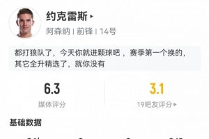 體育資訊12月14日訊 本輪英超,阿森納主場暫1-0狼隊。此役約克雷斯首發(fā)81分鐘被換下,球員全場重點數(shù)據(jù)如下↓