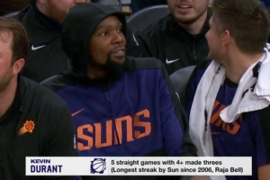 轉播方曬出數據,這是杜蘭特連續(xù)5場比賽至少投進4記三分。這是太陽隊史自2006年的拉加-貝爾以來,最長的紀錄。