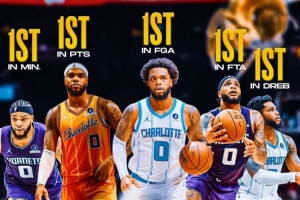 他在場均出場時間、總出場時間、總得分、場均得分、投籃出手數(shù)、罰球出手數(shù)、防守籃板總數(shù)等數(shù)據(jù)都是隊內(nèi)第一。