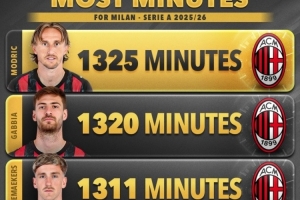 本賽季米蘭球員意甲出場(chǎng)時(shí)間榜: