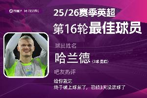 2025-2026賽季英超火熱進行中,體育資訊和咪咕體育聯(lián)合發(fā)起每輪英超最佳球員評選活動!第16輪評選結(jié)果已經(jīng)出爐,曼城前鋒哈蘭德當選!