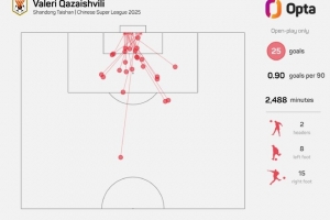 25 – 卡扎伊什維利本賽季在運(yùn)動(dòng)戰(zhàn)中攻入25粒進(jìn)球,刷新自有紀(jì)錄以來(lái)(2012年),任一球員單賽季中超運(yùn)動(dòng)戰(zhàn)進(jìn)球新高。