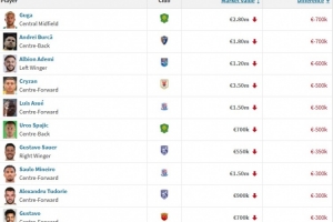 中超身價下降榜:古加、布爾克跌70萬歐居首,國安申花三鎮(zhèn)各2人