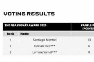 根據(jù)國際足聯(lián)官方公布的票數(shù)統(tǒng)計(jì)結(jié)果,蒙鐵爾以21分位列第一,賴斯和亞馬爾同積17分分列二三,官方僅給出了前三名的投票結(jié)果。