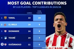 體育資訊12月18日訊 《轉(zhuǎn)會市場》統(tǒng)計(jì)了本賽季五大聯(lián)賽U19球員直接參與進(jìn)球榜,亞馬爾無懸念領(lǐng)跑。