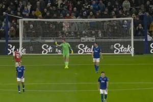 在約克雷斯罰進(jìn)點(diǎn)球后,埃弗頓門將皮克福德很懊惱。撿起皮球怒踢一腳險些踢到薩卡,隨后還朝阿森納球員比中指。