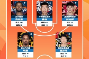 數(shù)據(jù)領先者方面:浙江方興渡球員布朗以單場41分的數(shù)據(jù)領銜得分榜;