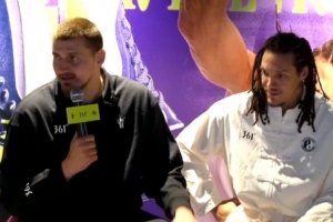 體育資訊12月22日訊 當(dāng)?shù)貢r間今天下午,掘金球星約基奇和戈登在球隊主場舉辦他們?nèi)潞灻娜虬l(fā)布活動。