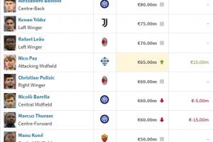 體育資訊12月23日訊 德轉(zhuǎn)今日更新意甲球員身價,勞塔羅最高8500萬歐不變,帕斯?jié)q至6500萬歐。