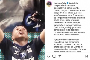 在轉(zhuǎn)會官宣后,達(dá)萬社媒發(fā)布視頻集錦,向大阪鋼巴球迷告別。他寫道:
