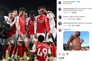 他也在賽后通過社媒曬出自己被隊(duì)友圍在一起的慶祝照,并配文:“為我們俱樂部打進(jìn)的一線隊(duì)首球??????我們繼續(xù)一起努力@阿森納俱樂部”。