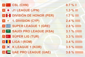 CIES統(tǒng)計數(shù)據(jù)基于當前賽季(非跨年賽事如中超則為2024賽季)出生于2004年以后的球員在所有比賽出場時間百分比。中超以0.7%排在“第一”,日本J聯(lián)賽、秘魯聯(lián)賽緊隨其后,沙特、韓國等聯(lián)賽同樣榜上有名。