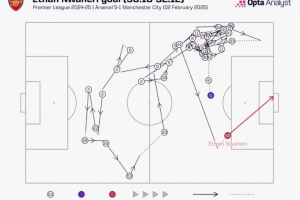 記者表示:我正在重溫阿森納對(duì)陣曼城時(shí)恩瓦內(nèi)里打進(jìn)的那粒進(jìn)球??厍驎r(shí)間1分54秒,連續(xù)傳球36腳,每名外場(chǎng)球員都有觸球,賴斯的轉(zhuǎn)移球以及最后的弧線球完成了終結(jié)。我知道曼城的表現(xiàn)很糟糕,但這粒進(jìn)球令人難以置信,本賽季最佳進(jìn)球之一。