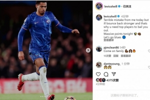 科爾維爾社媒曬出自己的比賽照片,配文:“我今天犯了一個(gè)可怕的錯(cuò)誤,但我會(huì)更強(qiáng)地反彈,這就是為什么你需要頂級(jí)球員來(lái)拯救你。今晚獲得了重要的積分,加油,藍(lán)軍!”
