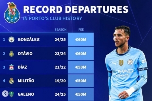 體育資訊2月4日訊 曼城已經(jīng)官宣簽下波爾圖中場(chǎng)尼科-岡薩雷斯,《轉(zhuǎn)會(huì)市場(chǎng)》也統(tǒng)計(jì)了波爾圖隊(duì)史賣人最貴榜。