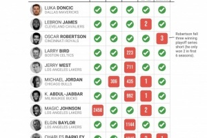 在生涯前6個賽季中,東契奇至少得到10000分、3000籃板、3000助攻,且5次入選年度最佳陣容一陣+贏下至少5個季后賽系列賽,是歷史唯一。