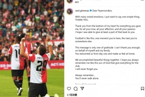 希門尼斯表示:“親愛的費耶諾德球迷們,我現(xiàn)在百感交集,只想說一句簡單的話語:感謝你們。我發(fā)自心底感激你們給予我的一切,感謝你們所有的愛與激情。我希望我在此前已經(jīng)多少回報了一部分。”