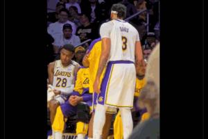老詹八村都笑了??濃眉走到詹姆斯旁邊站著 布朗尼隨后起身讓座