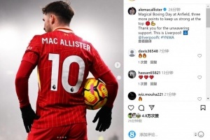 麥卡利斯特在社交媒體上曬出背影照片,并配文:“安菲爾德神奇的節(jié)禮日,再拿三分繼續(xù)強勢領跑?!?/p>