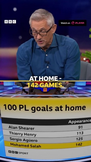 萊因克爾在BBC節(jié)目中調(diào)侃希勒,他指著數(shù)據(jù)統(tǒng)計(jì)說(shuō)道:“看看這個(gè),阿蘭(希勒)。薩拉赫142場(chǎng)比賽達(dá)成英超主場(chǎng)100球,某人只用了91場(chǎng)比賽。”