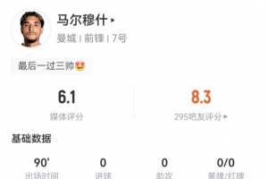 體育資訊2月8日訊 曼城在本輪足總杯2-1險(xiǎn)勝萊頓東方,馬爾穆什本場數(shù)據(jù)如下: