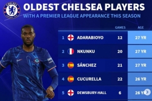 德轉(zhuǎn)列本賽季切爾西英超出場(chǎng)球員年齡最高榜: