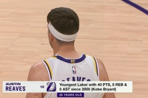 據(jù)統(tǒng)計(jì),里夫斯(26歲256天)成為自2005年的科比以來,單場得到至少40分5籃板5助攻的最年輕湖人球員。