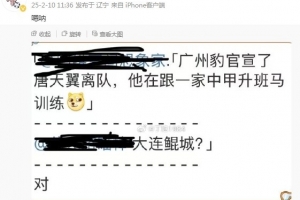 丁旭在社媒曬出了一張聊天截圖,截圖中是唐天翼跟隨大連鯤城訓(xùn)練的內(nèi)容,對此丁旭配文“嗯吶”,似乎是對此事予以了確認(rèn)。