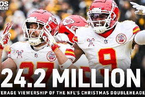 NFL記者Dov Kleiman曬出NFL與NBA的圣誕大戰(zhàn)場均觀看人數(shù)對比(NFL2420萬、NBA525萬),并寫到“圣誕屬于NBA??????”。