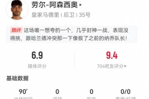 體育資訊2月12日訊 皇馬在本輪歐冠3-2逆轉(zhuǎn)曼城,小將勞爾-阿森西奧本場數(shù)據(jù)如下: