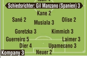 中場:格雷茨卡(3)、基米希(3)、薩內(nèi)(2)、穆西亞拉(3)、奧利塞(2)